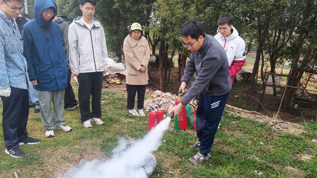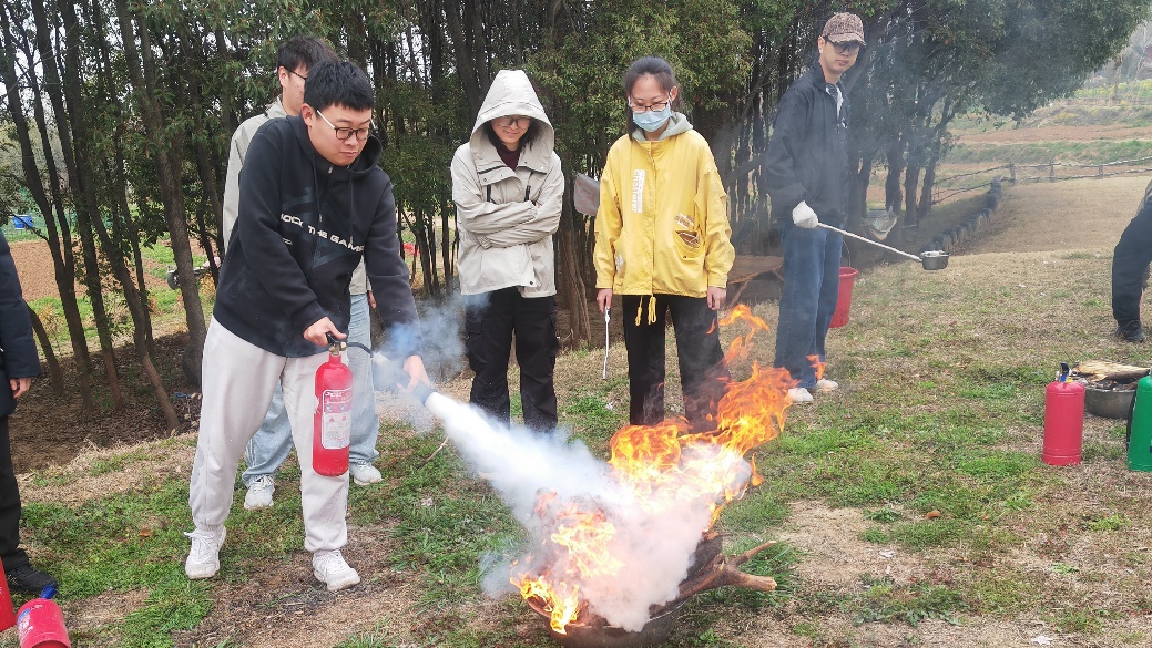 刘暄老师随后又向同学们介绍了干粉灭火器、水基灭火器和二氧化碳灭火器的灭火原理、操作技巧、注意事项,实地演示了灭火。在了解相关灭火器的使用注意事项后,同学们分组使用三种灭火器进行灭火演练。