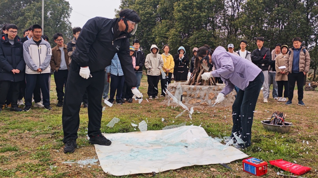 在消防演练中,学生工作部处刘暄老师向同学们展示介绍了投掷型灭火手雷、消防斧、消防锤、消防过滤式自救呼吸器、灭火毯等消防器材的工作原理、应用场景和使用方法,展示了全套消防服的穿戴方法,提醒同学们要注意身边潜在的危险,时刻提高警惕,掌握正确火场逃生方法。安全委员实地使用逃生安全锤进行车窗玻璃破窗操作,进行了消防绳打结练习。