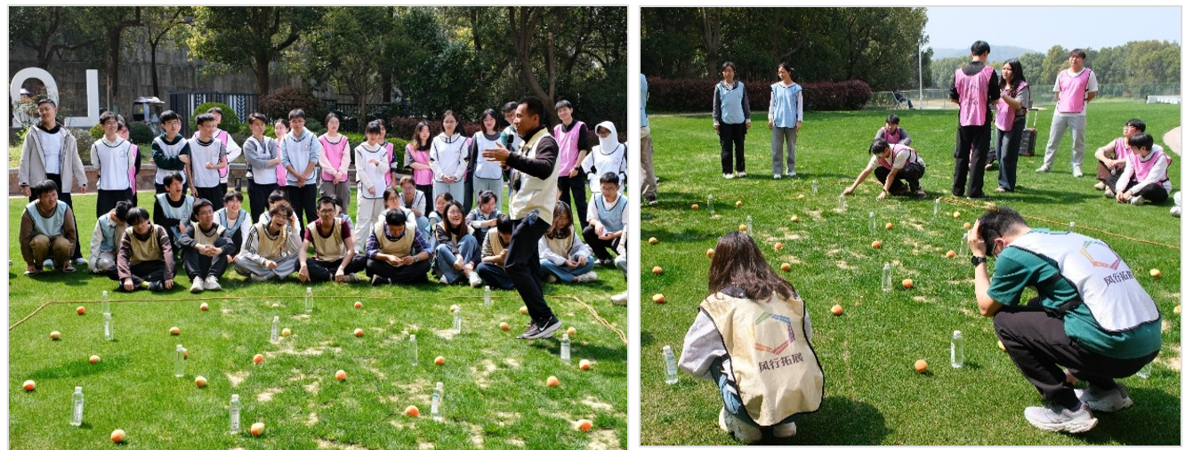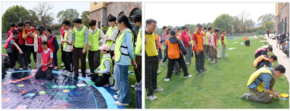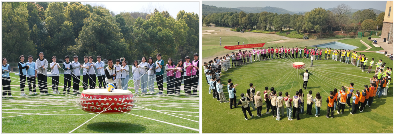 活动由专业户外拓展培训师带队开场,充实精彩的一日活动随即展开。破冰热身、成员分组、团队展示环环相扣,同学们在欢声笑语中破除隔阂,增进了解。百人战鼓是全员参与、高协同性的经典户外拓展项目,众人通过绳索共控巨鼓,连续颠起排球,是对个人技巧与团队配合的极致考验。通过该项目强化了团队协作意识,增强了集体荣誉感,直观展现“个体融入集体,协作创造奇迹” 的团队精神。